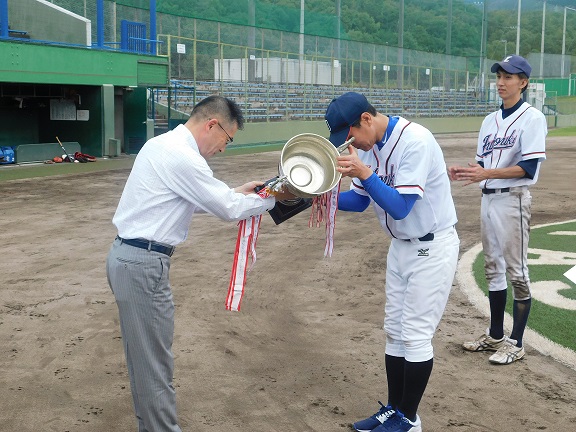 寿宝会の荒川投手は被安打4、奪三振12、1失点の完投勝利。